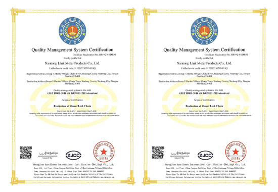 Nantong link metal products Co., Ltd. is a specialized manufacture of various kinds of steel link chains.It was established in 1996 with total area of 30000m2. Currently there are more than 200 employees.The factory has a professional technician team for nearly 20 years chain industry working experience.The products mainly fall into three parts,one is high tensile chains from 6mm to 30mm,another is stainless steel chains from 1.5mm to 50mm,the other is commercial chain from 1.5mm to 30mm.These products are widely used in lifting,coal mining,fishing,shipping and so on.Besides,we can produce any nonstandard link chains according to client’s requirements and drawings.